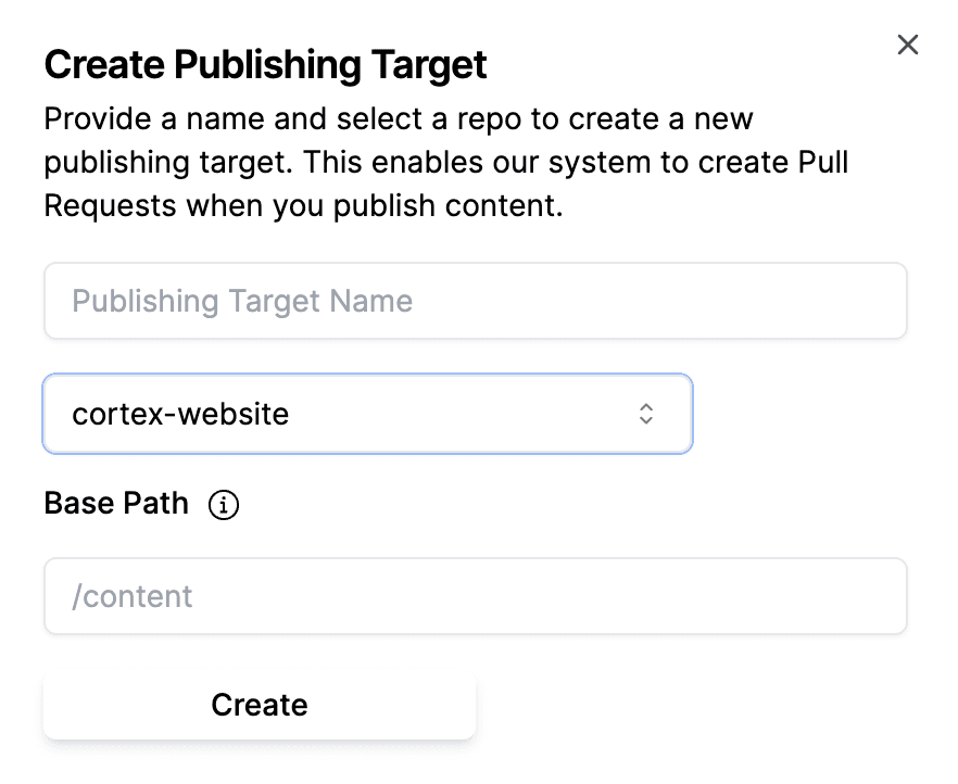 Click the "publish" button on any piece of content within the Cortex Click app to open a PR in GitHub. Select from pre-configured publication targets, or specify a custom path and extension where the content will be created in your repo.